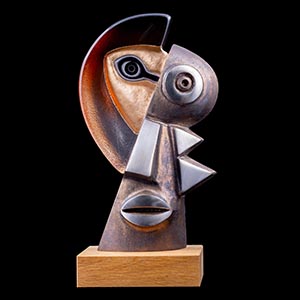 Pablo II is Mats Jonasson’s cubism style interpretation of Pablo Picasso himself. Pablo Picasso was a Spanish painter, sculptor, printmaker, ceramicist and stage designer considered one of the greatest and most influential artists of the 20th century. Picasso is credited, along with Georges Braque, with the creation of Cubism. Sculpture made of crystal and iron mounted on an oak wooden trophy base. The cast crystal is engraved, painted and sandblasted. The iron is casted and polished. The sculpture is produced in a limited edition of 19 pcs only. Designed and signed by Mats Jonasson handmade in Sweden Colour: Gold/brown H=350 mms / 14”